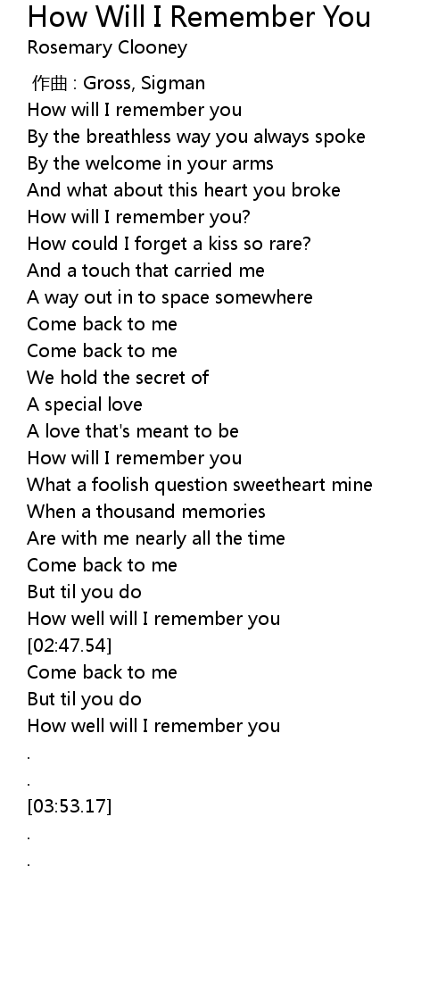 | [00:53.48] | How will I remember you? |