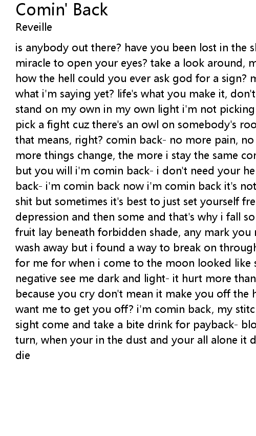 is anybody out there? have you been lost in the sky? do you really need a miracle to open your eyes? take a look around, mother fucking fantasy rides now how the hell could you ever ask god for a sign? moon rise, sunset, understand what i'm saying yet? life's what you make it, don't let time take it i gotta stand on my own in my own light i'm not picking you apart i'm just trying' to pick a fight cuz there's an owl on somebody's roof tonight and you know what that means, right? comin back- no more pain, no more games i'm comin back- the more things change, the more i stay the same comin back- you say that you won't but you will i'm comin back- i don't need your help in fact i know i'm comin back- i'm comin back now i'm comin back it's not like i like to talk about this shit but sometimes it's best to just set yourself free suppression leads to depression and then some and that's why i fall so far from this tree like the fruit lay beneath forbidden shade, any mark you make, with time, the rain will wash away but i found a way to break on through as long as hopes still waiting for me for when i come to the moon looked like skin cancer tonight in a photo negative see me dark and light- it hurt more than it felt good, understood? just because you cry don't mean it make you off the hook get you off the hook, you want me to get you off? i'm comin back, my stitches splitting my life for your sight come and take a bite drink for payback- blood sucker, suck me dry it's my turn, when your in the dust and your all alone it doesn't make a sound if you die |
