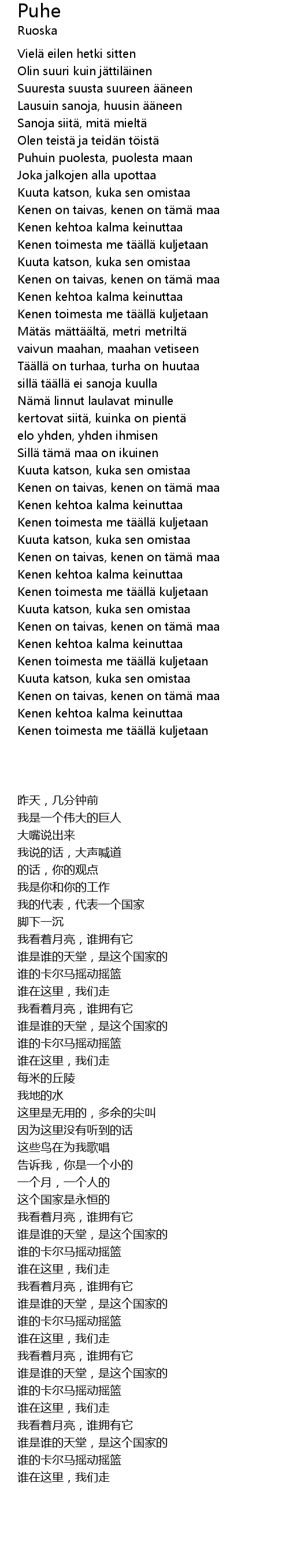 | [00:56.20] | Puhuin puolesta, puolesta maan |