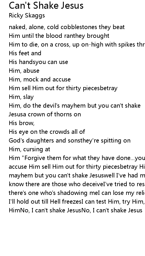Him "Forgive them for what they have done...you can use Him, abuse Him, mock and accuse Him sell Him out for thirty piecesbetray Him, slay Him, do the devil's mayhem but you can't shake Jesuswell I've had my bouts, questions and doubts you know there are those who deceiveI've tried to resist, escape and dismiss but there's one who's shadowing meI can lose my religion, break with tradition say I'll hold out till Hell freezesI can test Him, try Him, but I just can't deny HimNo, I can't shake JesusNo, I can't shake Jesus |