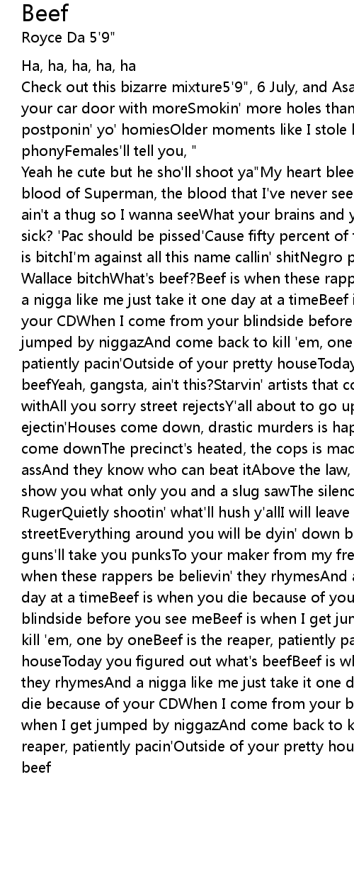 Yeah he cute but he sho'll shoot ya"My heart bleeds the blood of feloniesThe blood of Superman, the blood that I've never seenYou seem like the shook typeYou ain't a thug so I wanna seeWhat your brains and your blood look likeFuck is you sick? 'Pac should be pissed'Cause fifty percent of the niggaz suckin' his dick is bitchI'm against all this name callin' shitNegro please, listen to Chris Wallace bitchWhat's beef?Beef is when these rappers be believin' they rhymesAnd a nigga like me just take it one day at a timeBeef is when you die because of your CDWhen I come from your blindside before you see meBeef is when I get jumped by niggazAnd come back to kill 'em, one by oneBeef is the reaper, patiently pacin'Outside of your pretty houseToday you figured out what's beefYeah, gangsta, ain't this?Starvin' artists that comes with the guns he paint withAll you sorry street rejectsY'all about to go up in smoke, seats ejectin'Houses come down, drastic murders is happenin'Make a nigga momma mouth come downThe precinct's heated, the cops is madBecause they know who shot yo' assAnd they know who can beat itAbove the law, run up on y'allSo quickly and show you what only you and a slug sawThe silence is screwed in front of the .9 RugerQuietly shootin' what'll hush y'allI will leave you lyin' down in a streetEverything around you will be dyin' down but the beefPlease believe, my guns'll take you punksTo your maker from my freezin' sleeveWhat's beef?Beef is when these rappers be believin' they rhymesAnd a nigga like me just take it one day at a timeBeef is when you die because of your CDWhen I come from your blindside before you see meBeef is when I get jumped by niggazAnd come back to kill 'em, one by oneBeef is the reaper, patiently pacin'Outside of your pretty houseToday you figured out what's beefBeef is when these rappers be believin' they rhymesAnd a nigga like me just take it one day at a timeBeef is when you die because of your CDWhen I come from your blindside before you see meBeef is when I get jumped by niggazAnd come back to kill 'em, one by oneBeef is the reaper, patiently pacin'Outside of your pretty houseToday you figured out what's beef |