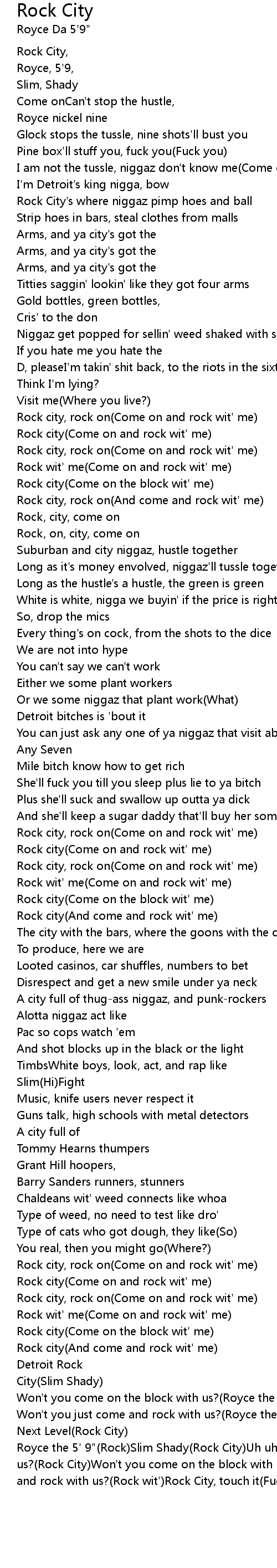 Royce the 5' 9"(Rock)Slim Shady(Rock City)Uh uh, won't you come and rock with us?(Rock City)Won't you come on the block with us?(Rock wit me)Won't you come and rock with us?(Rock wit')Rock City, touch it(Fuck) |