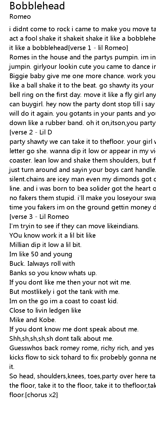 | [chorus]i didnt come to rock i came to make you move take it to the floor and act a fool shake it shakeit shake it like a bobblehead shake it shake it shake it like a bobblehead[verse 1 - lil Romeo] | |