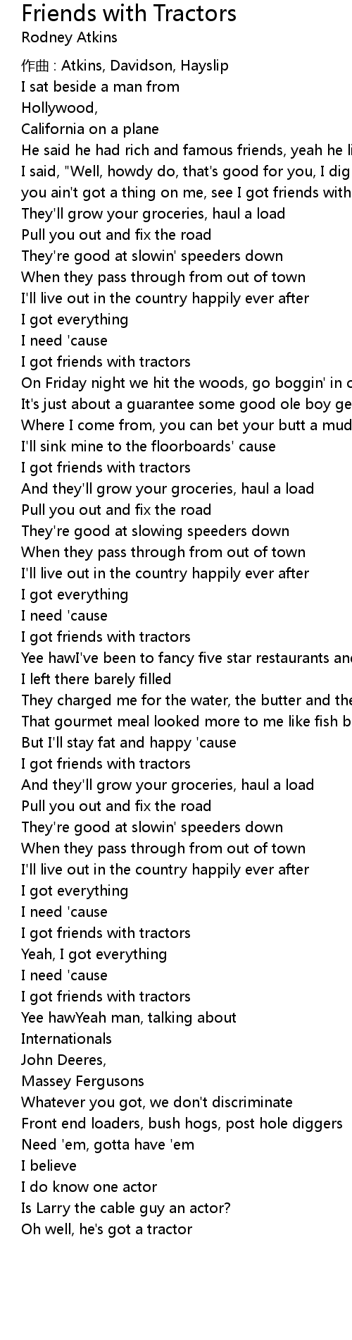 | I said, " Well, howdy do, that' s good for you, I dig a lot of those actorsBut son you ain' t got a thing on me, see I got friends with tractors" | |