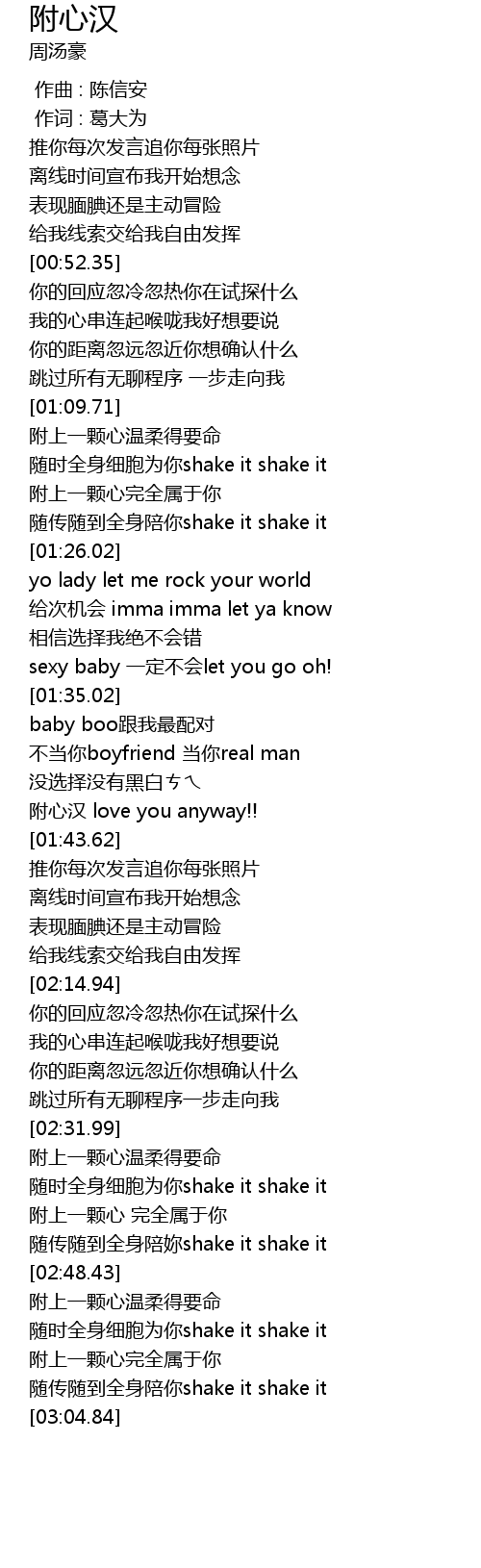 | [03:01.65] | 随传随到全身陪你shake it shake it |