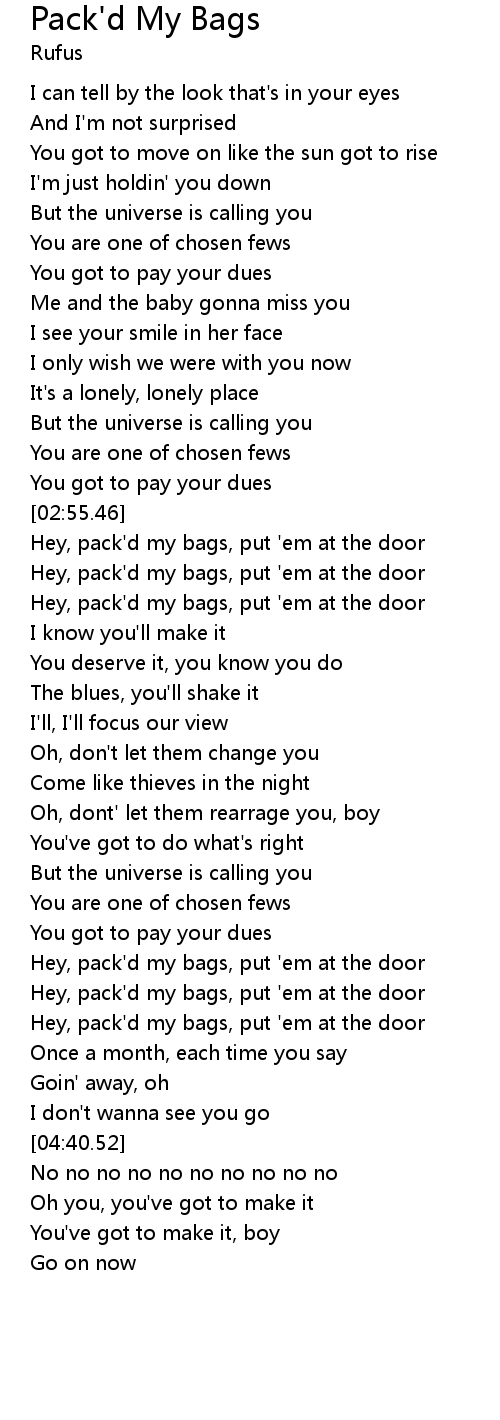 | [03:01.52] | Hey, pack'd my bags, put 'em at the door |