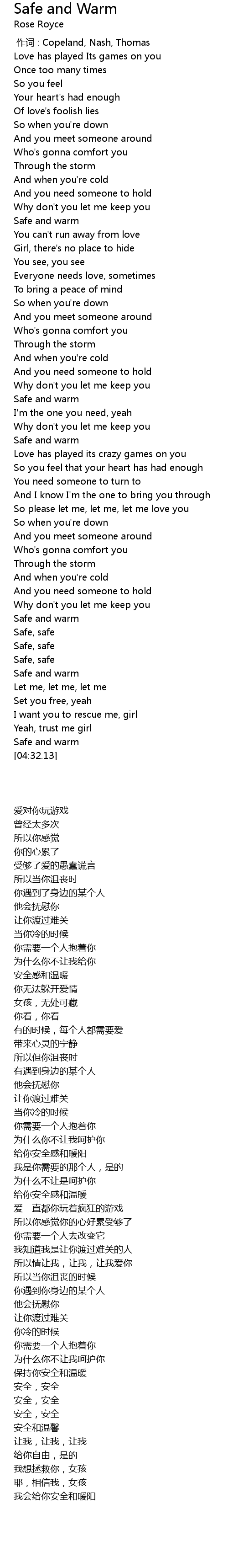| [04:25.43] | Safe and warm |