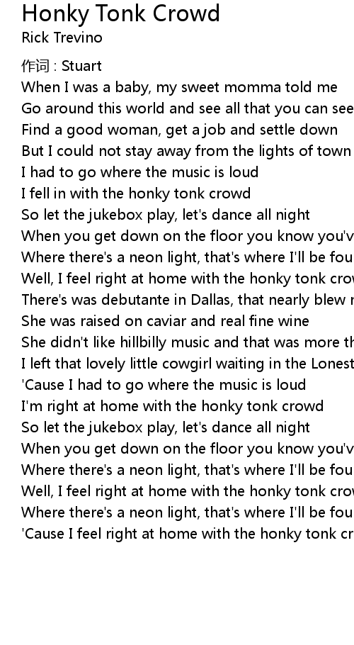 | I' m right at home with the honky tonk crowd | |