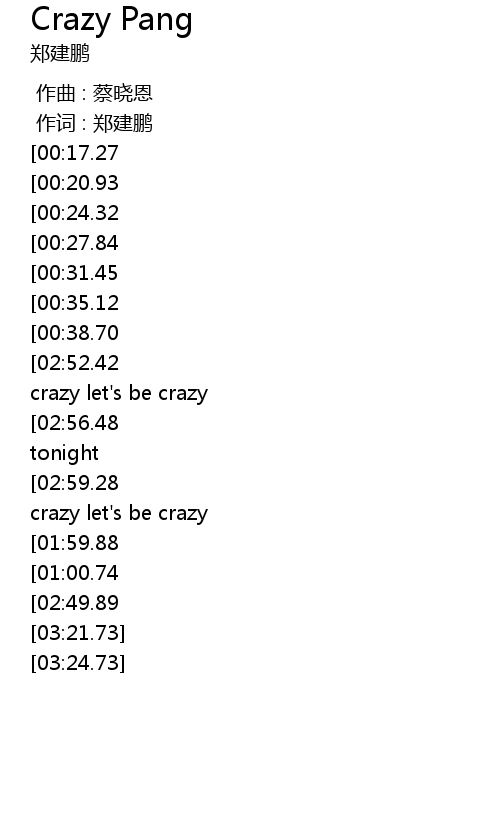 | [03:13.24][02:59.28][02:45.16][01:55.82][01:41.69][00:52.46] | Come on let' s be crazy let' s be crazy |