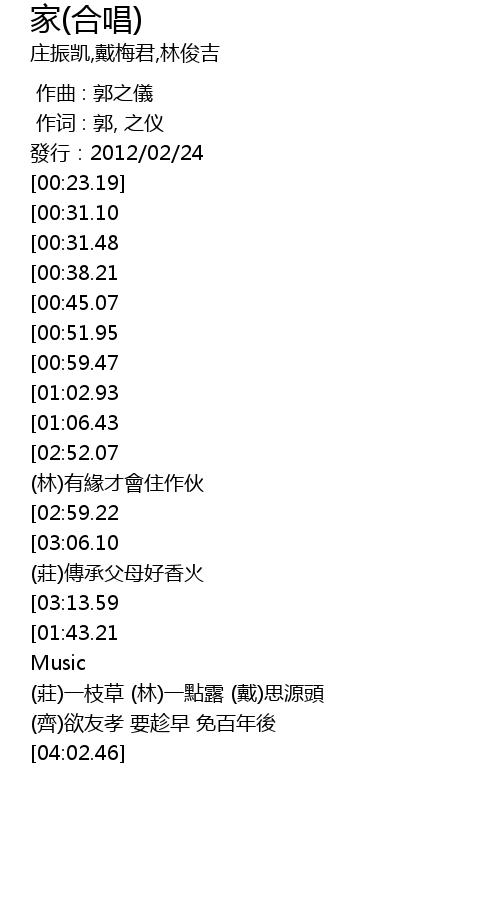 | [03:20.04][02:52.07][01:12.82] | (莊)有情天 (戴)有情地 (林)有緣才會住作伙 |