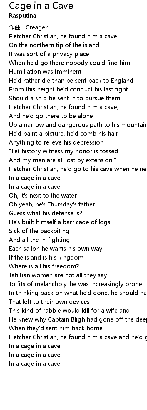 | Fletcher Christian, he found him a cave and he' d go there to be alone | |
