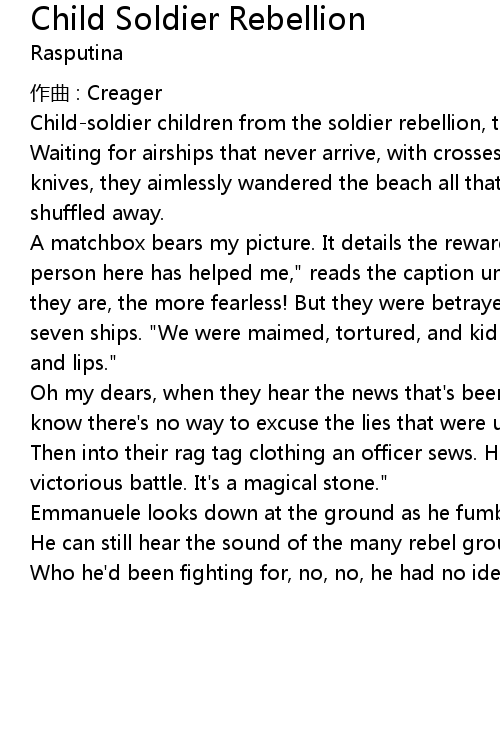 | Childsoldier children from the soldier rebellion, these children rebel again. Waiting for airships that never arrive, with crosses on suitcases, novelty knives, they aimlessly wandered the beach all that day. Eventually most of them shuffled away. | |