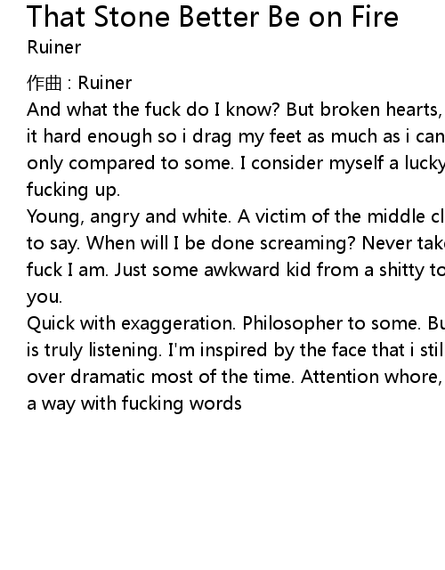 | And what the fuck do I know? But broken hearts, some unsung songs. I never had it hard enough so i drag my feet as much as i can. The product of excuses. Brave only compared to some. I consider myself a lucky kid, but I' m pretty good at fucking up. | |