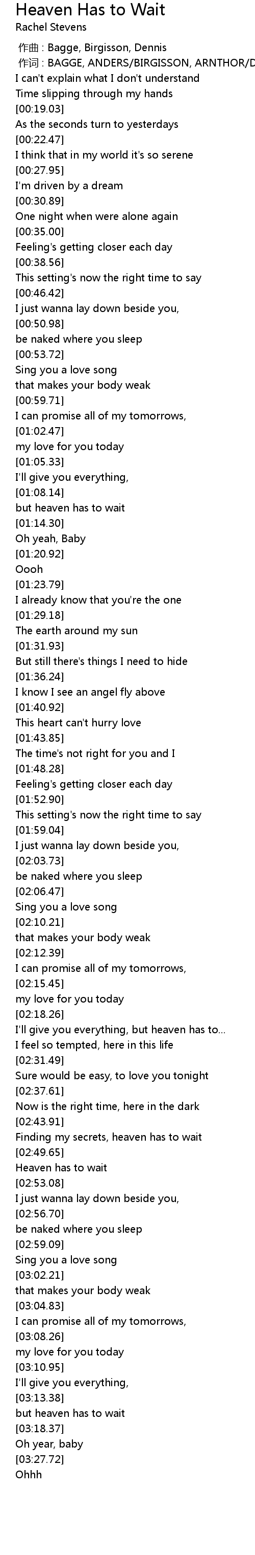 | [02:45.41] | Finding my secrets, heaven has to wait |