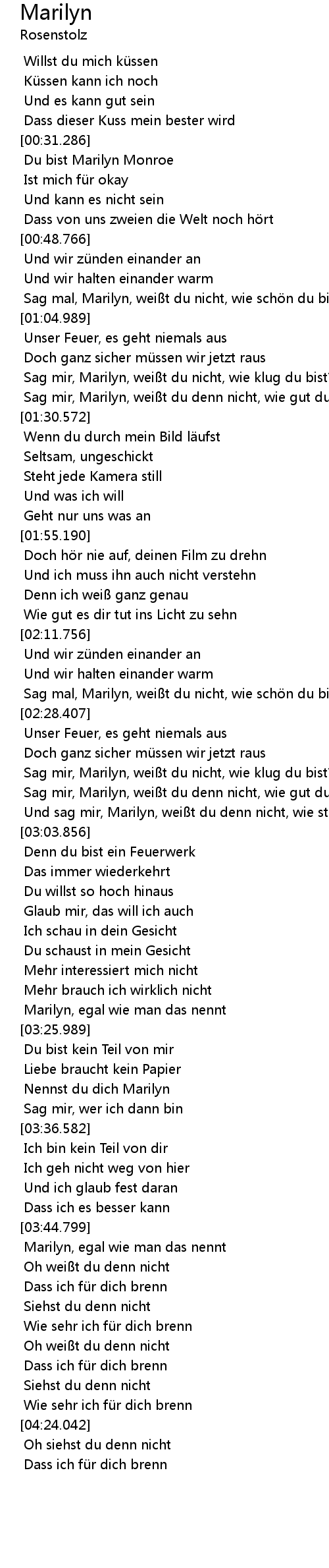 | [00:58.382] | Sag mal, Marilyn, wei t du nicht, wie sch n du bist? |
