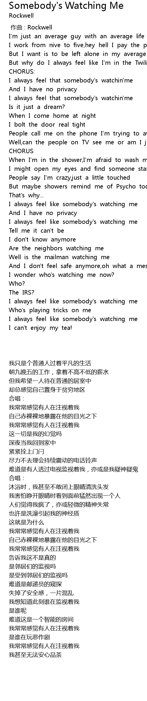 | [00:50.38] | I always feel that somebody' s watchin' me |