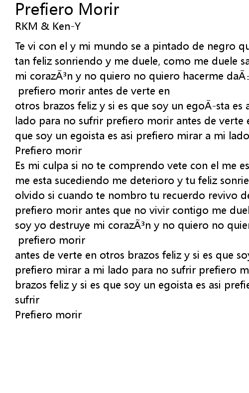| Te vi con el y mi mundo se a pintado de negro que encuentro aquel parecÃas tan feliz sonriendo y me duele, como me duele saber que ese no soy yo destruye mi corazón y no quiero no quiero hacerme daño me quiero escapar lejos de aquà antes de aceptar que te perdà [CORO] prefiero morir antes de verte en otros brazos feliz y si es que soy un egoÃsta es asà prefiero mirar a mi lado para no sufrir prefiero morir antes de verte en otros brazos feliz y si es que soy un egoista es asi prefiero mirar a mi lado para no sufrir | |