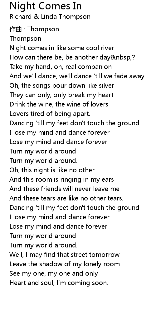 | Night comes in like some cool river | |