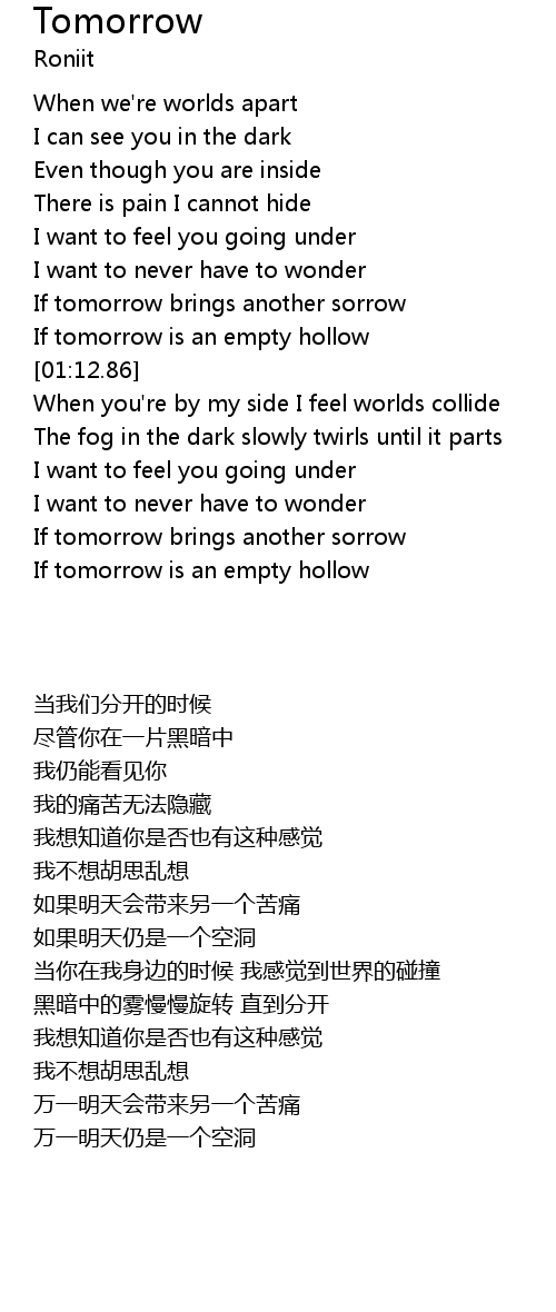 | [01:26.63] | When you're by my side I feel worlds collide |