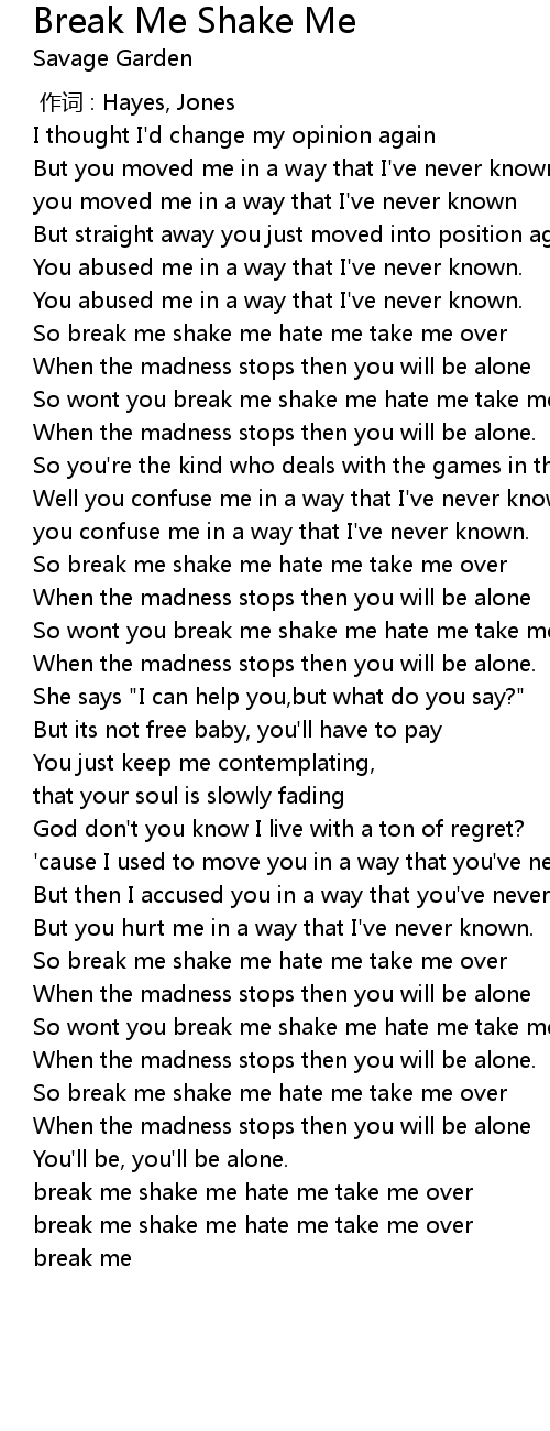 | [00:50.50] | So wont you break me shake me hate me take me over |
