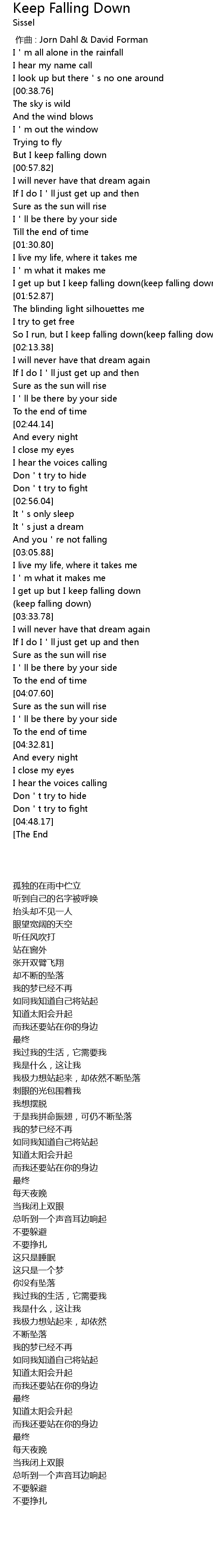 | [02:02.64] | So I run, but I keep falling down keep falling down |