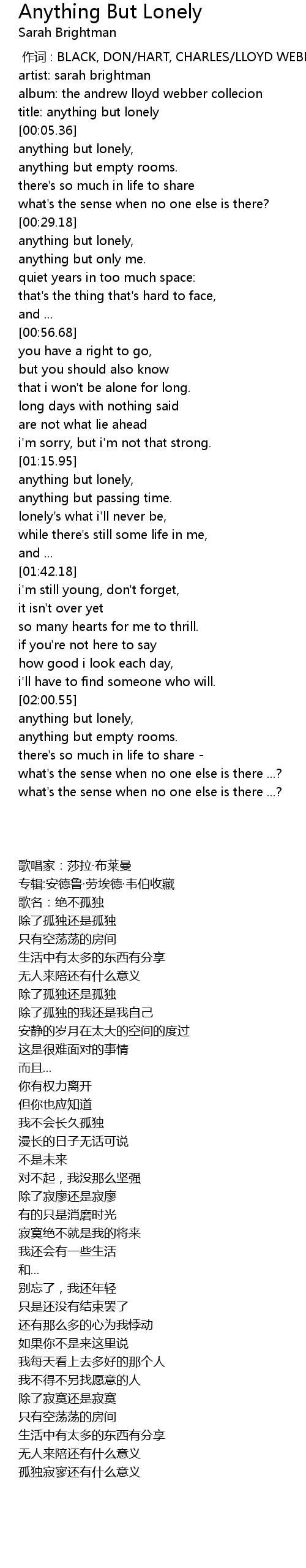 | [00:00.00] | zuo ci : BLACK, DON HART, CHARLES LLOYD WEBBER, ANDREW |