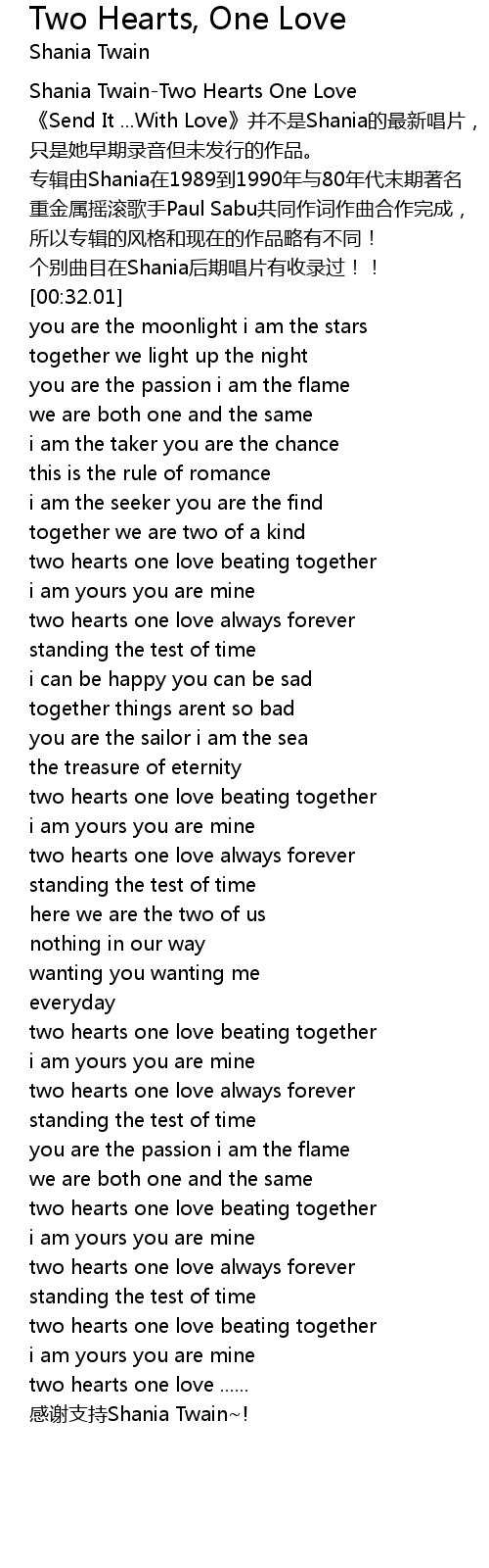 | [00:01.03] | Shania Twain-Two Hearts One Love |