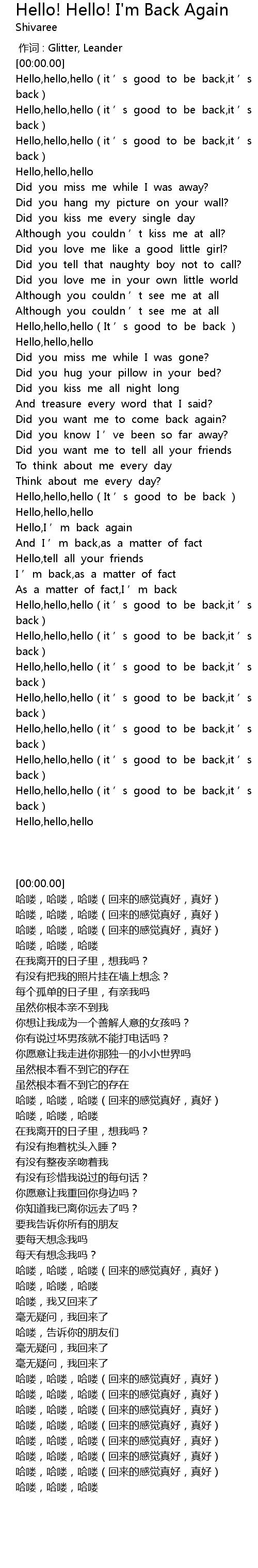 | [00:12.50] | Hello,hello,hello(it ’s good to be back,it ’s good to be back) |