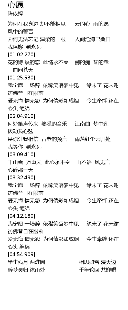 | [00:22.600] | 为何在我身边 却不能相见 云的心 雨的愿 风中的誓言 |