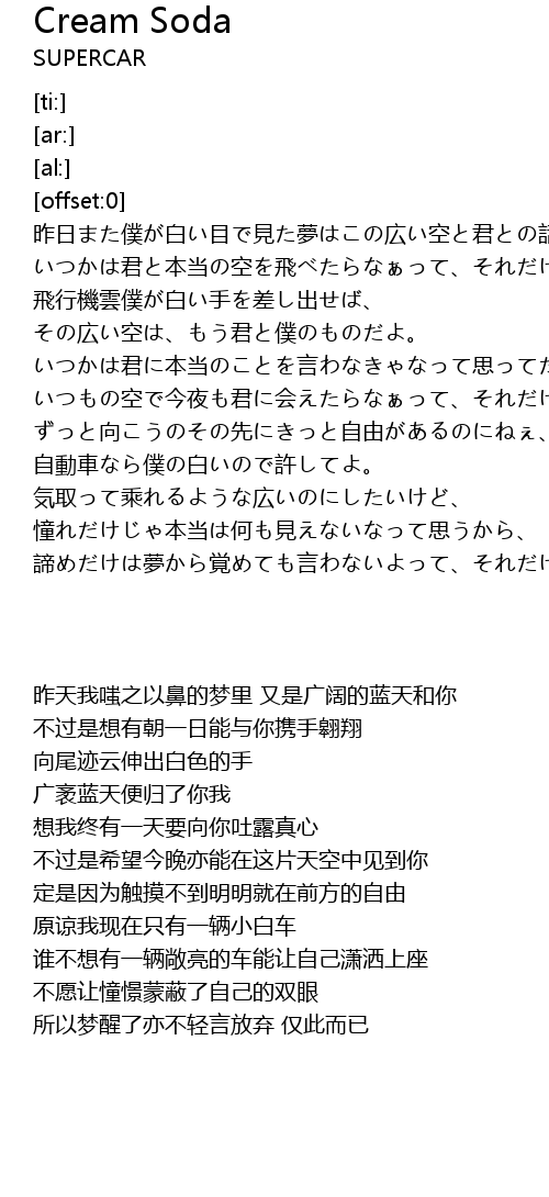 | [00:24.98] | 昨日また僕が白い目で見た夢はこの広い空と君との話だよ。 |