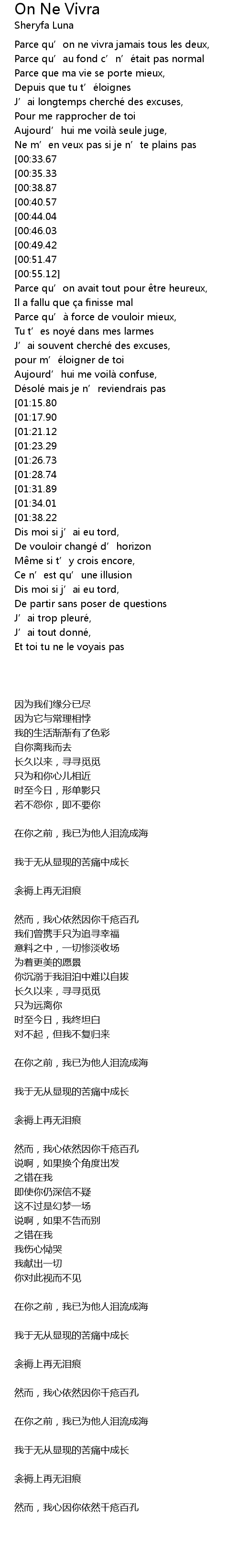 | [02:27.29][00:51.47] | Mais pourtant je souffre autant que toi |