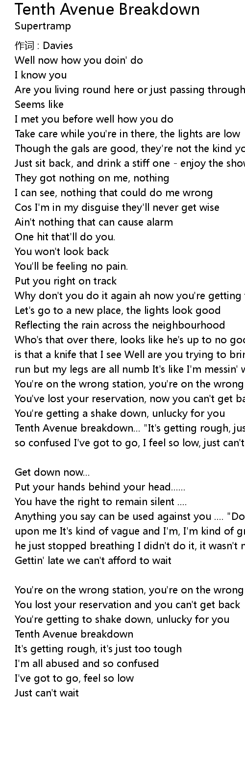 | Tenth Avenue breakdown... " It' s getting rough, just too tough I' m all abused and so confused I' ve got to go, I feel so low, just can' t wait It' s gettin' late..." Spoken: Policeman' s words | |