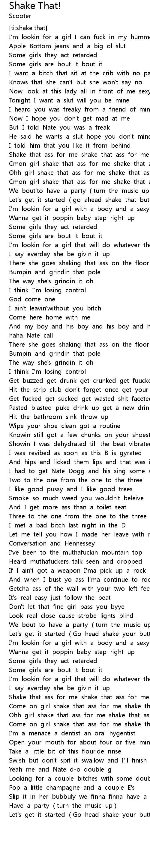 | [00:09.200] | Cmon girl shake that ass for me shake that ass for me |