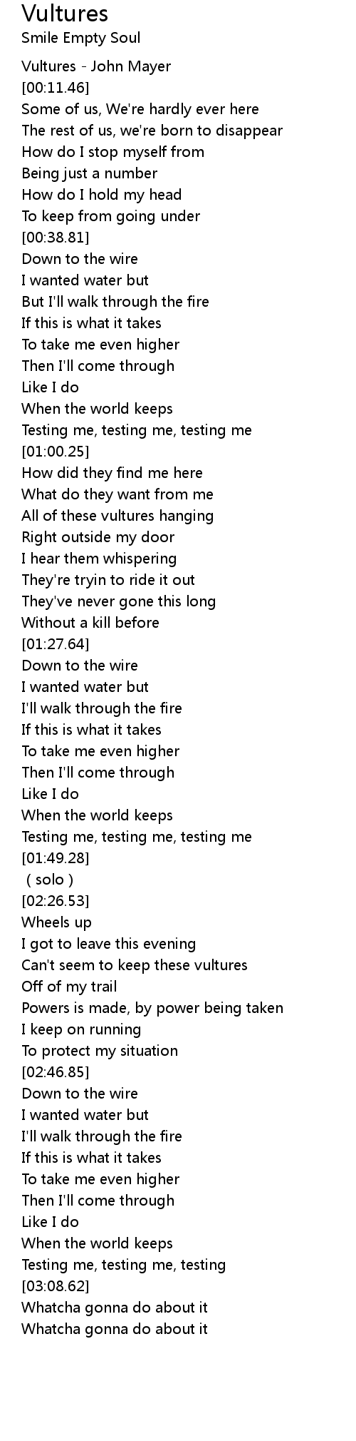 | [00:03.29] | Vultures - John Mayer |