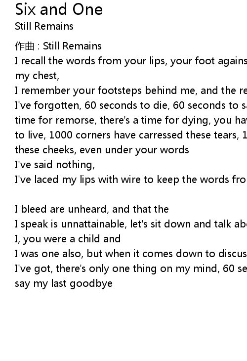| I' ve forgotten, 60 seconds to die, 60 seconds to say my last goodbye, there' s a time for remorse, there' s a time for dying, you have no control, this is my time to live, 1000 corners have carressed these tears, 1000 tears have comforted these cheeks, even under your words | |
