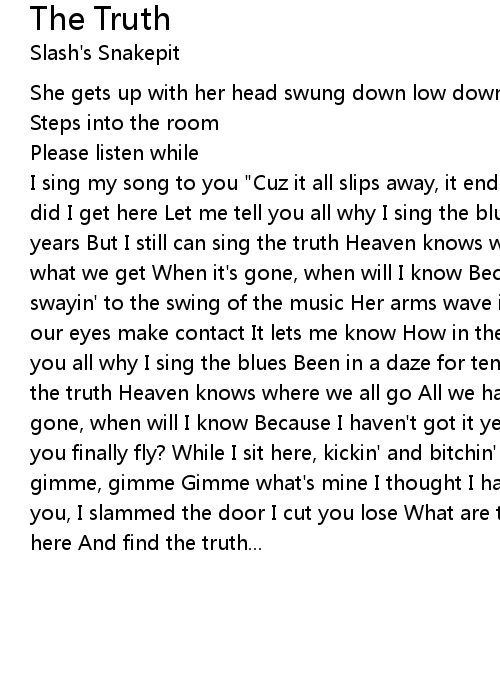 I sing my song to you "Cuz it all slips away, it ends too soon How in the hell did I get here Let me tell you all why I sing the blues Been in a daze for ten years But I still can sing the truth Heaven knows where we all go All we have is what we get When it's gone, when will I know Because I haven't got it yet She's swayin' to the swing of the music Her arms wave in the air She turns her head, our eyes make contact It lets me know How in the hell did I get here Let me tell you all why I sing the blues Been in a daze for ten years But I can still sing the truth Heaven knows where we all go All we have is what we get When it's gone, when will I know Because I haven't got it yet Did you find that ride? Did you finally fly? While I sit here, kickin' and bitchin' Sayin' gimme, gimme, gimme, gimme Gimme what's mine I thought I had it all, I wanted more No need for you, I slammed the door I cut you lose What are the chances that I'd walk in here And find the truth... |