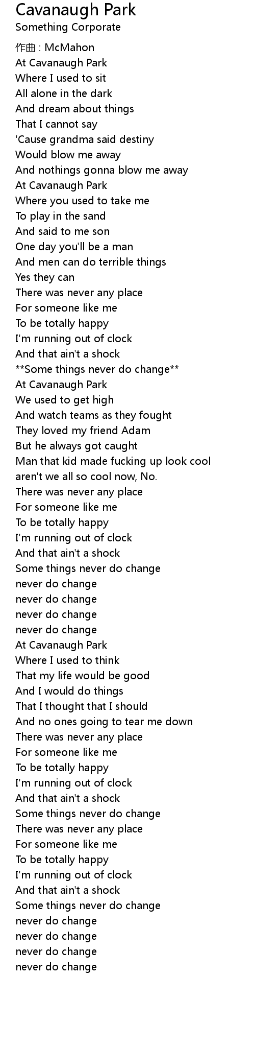 | Song | Cavanaugh Park |