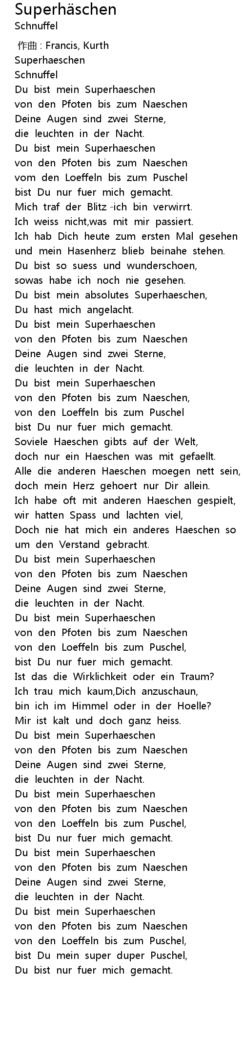 | [01:55.282] | Du bist mein Superhaeschen |