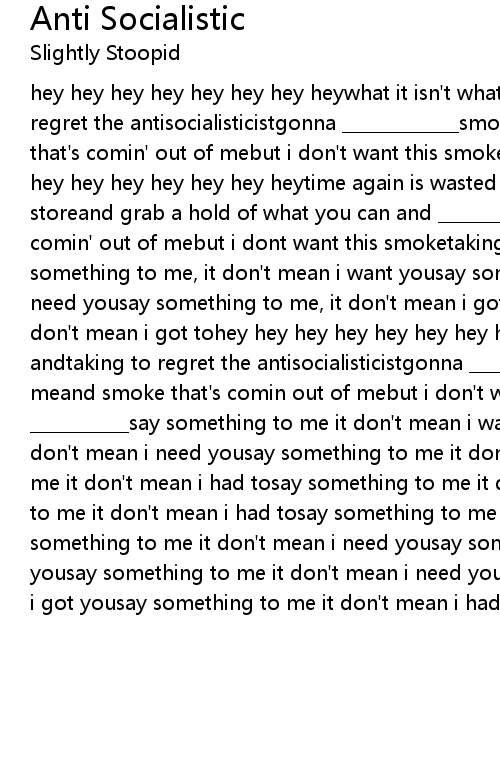 hey hey hey hey hey hey hey heywhat it isn't what you get andtaking time out to regret the antisocialisticistgonna _____________smoke comin' over meand smoke that's comin' out of mebut i don't want this smoketaking over me ___________hey hey hey hey hey hey hey heytime again is wasted drinkin' 40's from the liquor storeand grab a hold of what you can and ___________________and smoke that's comin' out of mebut i dont want this smoketaking over me ___________say something to me, it don't mean i want yousay something to me, it don't mean i need yousay something to me, it don't mean i got yousay something to me, it don't mean i got tohey hey hey hey hey hey hey heywhat it isn't what you get andtaking to regret the antisocialisticistgonna __________smoke comin' over meand smoke that's comin out of mebut i don't want this smoketaking over me ___________say something to me it don't mean i want yousay something to me it don't mean i need yousay something to me it don't mean i got yousay something to me it don't mean i had tosay something to me it don't mean i got tosay something to me it don't mean i had tosay something to me it don't mean i want yousay something to me it don't mean i need yousay something to me it don't mean i want yousay something to me it don't mean i need yousay something to me it don't mean i got yousay something to me it don't mean i had to |