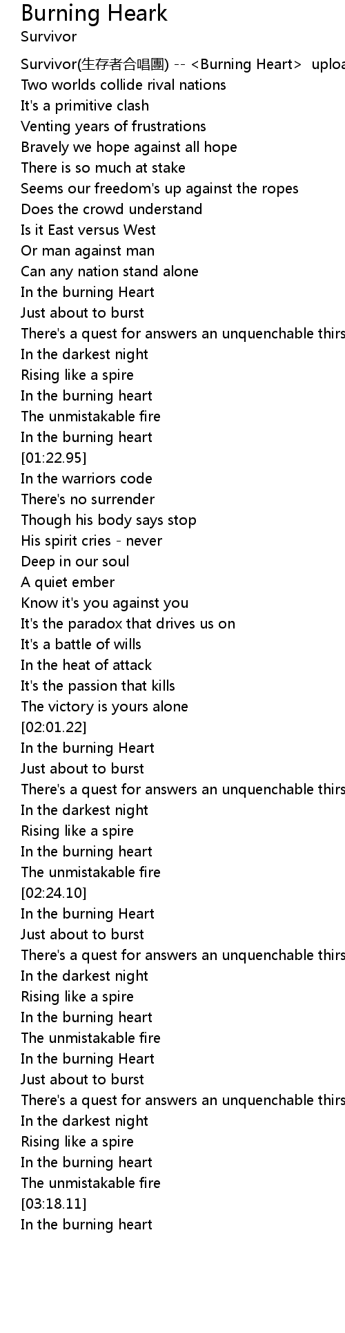 | [00:00.00] | Survivor(生存者合唱團) -- <Burning Heart> upload by Giga97 |