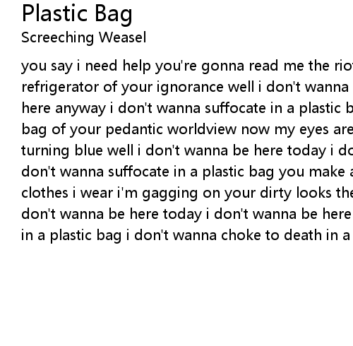 you say i need help you're gonna read me the riot act i'm stuck in the refrigerator of your ignorance well i don't wanna be here today i don't wanna be here anyway i don't wanna suffocate in a plastic bag i'm stuck inside the hefty bag of your pedantic worldview now my eyes are bugging out and my lips are turning blue well i don't wanna be here today i don't wanna be here anyway i don't wanna suffocate in a plastic bag you make a federal case out of the clothes i wear i'm gagging on your dirty looks they're cutting off my air well i don't wanna be here today i don't wanna be here anyway i don't wanna suffocate in a plastic bag i don't wanna choke to death in a plastic bag |