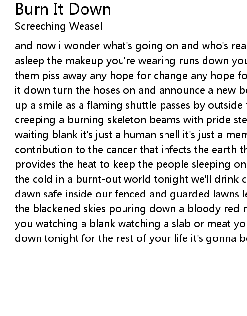 and now i wonder what's going on and who's really in another world while you're asleep the makeup you're wearing runs down your face like so many tears watch them piss away any hope for change any hope for anything new and watch them burn it down turn the hoses on and announce a new beginning tonight we wave and give up a smile as a flaming shuttle passes by outside the window something is creeping a burning skeleton beams with pride step over bodies past corpses in waiting blank it's just a human shell it's just a memory your indecision is a contribution to the cancer that infects the earth that impassioned speech almost provides the heat to keep the people sleeping on the streets warm out there in the cold in a burnt-out world tonight we'll drink champagne and dance until it's dawn safe inside our fenced and guarded lawns let it burn down tonight ignore the blackened skies pouring down a bloody red rain your television's watching you watching a blank watching a slab or meat you're just a memory it's burning down tonight for the rest of your life it's gonna be so cold |