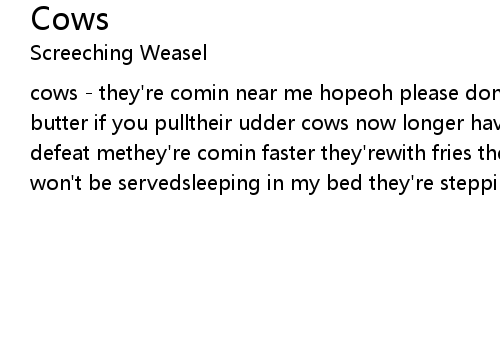 | cows - they're comin near me hopeoh please don't eat me ! cows -won't give you butter if you pulltheir udder cows now longer havethey don't see me they can't defeat methey're comin faster they'rewith fries they have no mastersad eyes they won't be servedsleeping in my bed they're stepping on my head ! moo! |