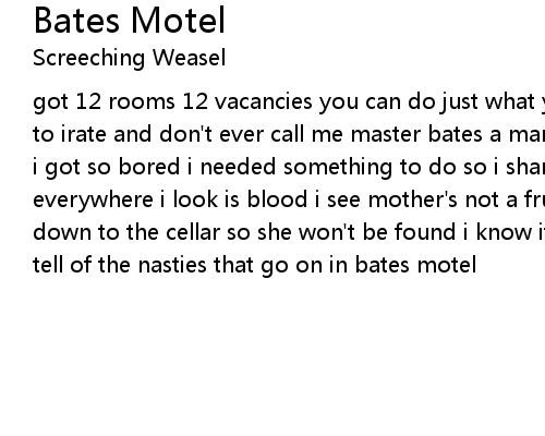 | got 12 rooms 12 vacancies you can do just what you please just don't get mother to irate and don't ever call me master bates a man should have a hobby, true but i got so bored i needed something to do so i sharpened mother's cutlery now everywhere i look is blood i see mother's not a fruit but she's gotta go down down to the cellar so she won't be found i know it's not right but i just can't tell of the nasties that go on in bates motel |