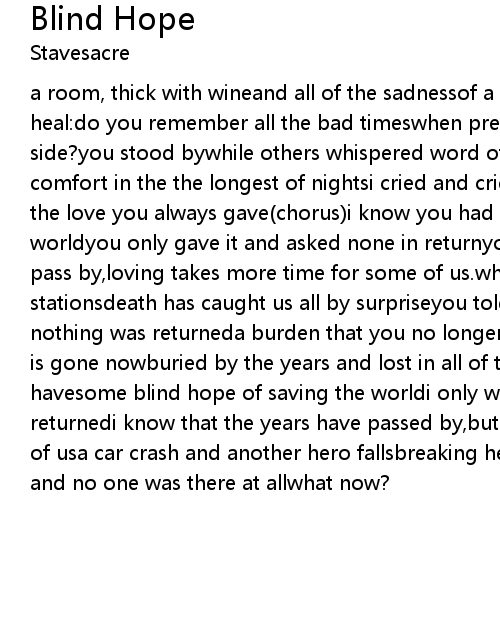 a room, thick with wineand all of the sadnessof a heart that time alone won't heal:do you remember all the bad timeswhen precious few were found by my side?you stood bywhile others whispered word of my demise.your presence... a comfort in the the longest of nightsi cried and cried and you let mehide behind the love you always gave(chorus)i know you had no blind hope of saving the worldyou only gave it and asked none in returnyou knew that though years may pass by,loving takes more time for some of us.while in retreat to all our outer stationsdeath has caught us all by surpriseyou told me,you gave so long and nothing was returneda burden that you no longer choose to endureand all you were is gone nowburied by the years and lost in all of the words(chorus)i don't havesome blind hope of saving the worldi only wanted you to know your love is returnedi know that the years have passed by,but loving takes more time for some of usa car crash and another hero fallsbreaking hearts and phone callseveryone and no one was there at allwhat now? |