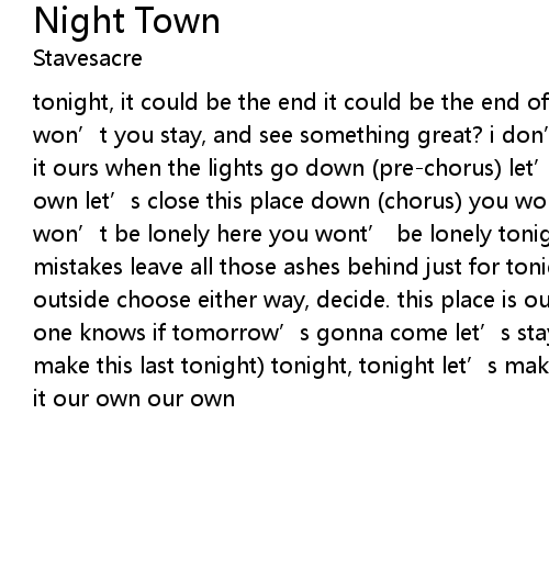 | tonight, it could be the end it could be the end of our lives our last goodbyes won' t you stay, and see something great? i don' t want to waste tonight make it ours when the lights go down prechorus let' s make this last, make it our own let' s close this place down chorus you won' t be lonely here you won' t be lonely here you wont' be lonely tonight tonight, forget your mistakes leave all those ashes behind just for tonight tear away, or just stay outside choose either way, decide. this place is ours when the lights go down no one knows if tomorrow' s gonna come let' s stay out all night tonight let' s make this last tonight tonight, tonight let' s make this our own tonight. make it our own our own |