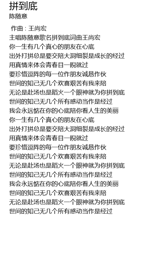| [00:11.66] | 主唱陈随意歌名拼到底词曲王尚宏 |