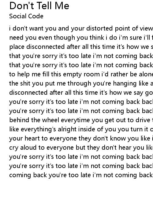 i don't want you and your distorted point of view looking down on me i don't need you even though you think i do i'm sure i'll find someone to take your place disconnected after all this time it's how we say goodbye don't tell me that you're sorry it's too late i'm not coming back back to you don't tell me that you're sorry it's too late i'm not coming back back to you i don't need you to help me fill this empty room i'd rather be alone i think i hate you from all the shit you put me through you're hanging like a noose around my neck disconnected after all this time it's how we say goodbye don't tell me that you're sorry it's too late i'm not coming back back to you don't tell me that you're sorry it's too late i'm not coming back back to you you fall asleep behind the wheel everytime you get out to drive taking pills to make you feel like everything's alright inside of you you turn it off and turn it on you give your heart to everyone they don't know you like i do turn it off and turn it on cry aloud to everyone but they don't hear you like i do don't tell me that you're sorry it's too late i'm not coming back back to you don't tell me that you're sorry it's too late i'm not coming back back to you it's too late i'm not coming back you're too late i'm not coming back to you not back to you |