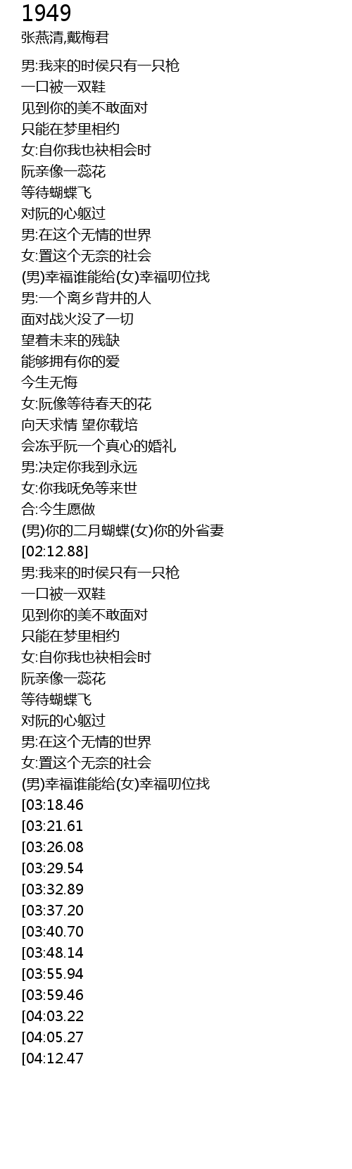 | [05:01.55][04:05.27] | (男)你的二月蝴蝶(女)你的外省妻 |