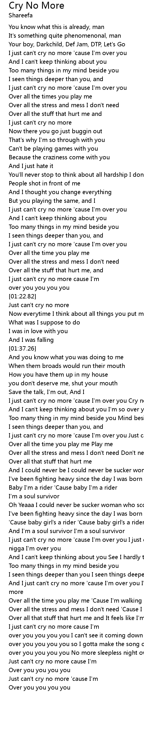 I just can't cry no more 'cause I'm over you Just can't cry no more |